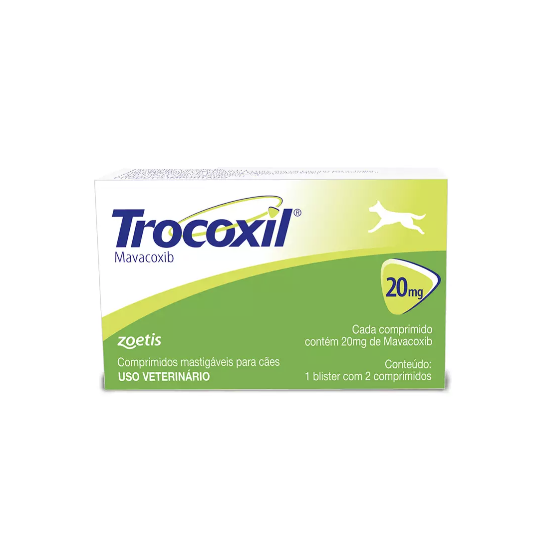 Trocoxil é um anti-inflamatório não-esteroidal usado para tratar dor e inflamação. É indicado no tratamento de dor e inflamação associados à doença articular degenerativa em cães, quando necessário tratamento por mais de um mês. Fórmula: Cada 100mg contém: Mavacoxib - 5mg Excipientes - 100mg