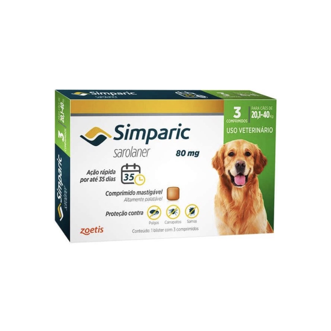 Simparic é um comprimido saboroso que combate carrapatos, pulgas e sarnas. É eficaz, seguro e possui ação rápida e sustentada por até 35 dias.