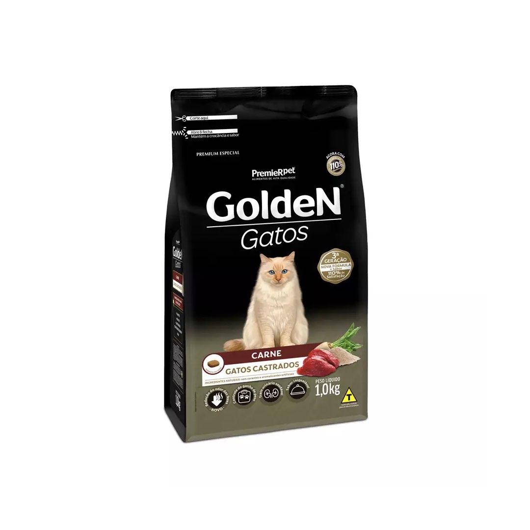 <p>Detalhes do produto: Indicada para gatos adultos | Indicada para gatos a partir 6 messes de vida e cadastrados, esse procedimento é cada vez mais recomendado pelos médicos veterinários, pois promove vários benefícios ao animal, mas também alterações fisiológicas que exigem alguns cuidados extras com a dieta do seu gato | Especialmente formulada para atender às necessidades dos gatos castrados, golden gatos castrados carne auxilia na prevenção da obesidade e no cuidado com o trato urinário, garantindo uma nutrição ótima e saudável.</p>