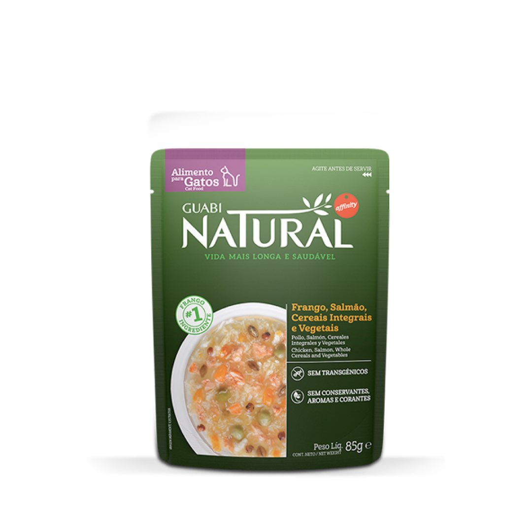 RAÇÃO ÚMIDA GUABI NATURAL SACHÊ GATO ADULTO CASTRADO FRANGO, SALMÃO, CEREAIS INTEGRAIS E VEGETAIS 85G